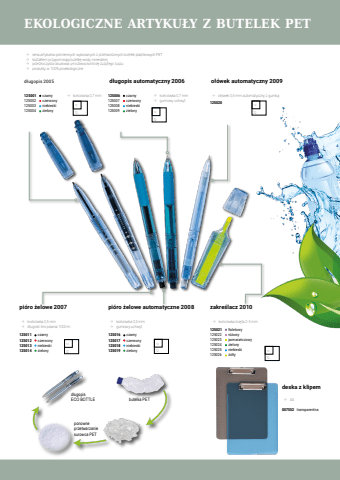 pi%u00f3ro %u017celowe automatyczne 2008 %u2192 ko%u0144c%u00f3wka 0,5 mm%u2192 gumowy uchwyt125016 czarny125017 czerwony125018 niebieski125019 zielonyd%u0142ugopis 2005125001 czarny125002 czerwony125003 niebieski125004 zielony125006 czarny125007 czerwony125008 niebieski125009 zielonypi%u00f3ro %u017celowe 2007 125011 czarny125012 czerwony125013 niebieski125014 zielonyo%u0142%u00f3wek automatyczny 2009%u2192 o%u0142%u00f3wek 0,5 mm automatyczny z%u00a0gumk%u0105125020zakre%u015blacz 2010deska z klipem%u2192 ko%u0144c%u00f3wka %u015bci%u0119ta 2-5 mm%u2192 A4125021 fioletowy125022 r%u00f3%u017cowy125023 pomara%u0144czowy125024 zielony125025 niebieski125026 %u017c%u00f3%u0142ty007552 transparentna%u2192 seria artyku%u0142%u00f3w pi%u015bmiennych wykonanych z%u00a0przetworzonych butelek plastikowych PET%u2192 kszta%u0142tem przypominaj%u0105 butelk%u0119 wody mineralnej%u2192 prze%u017aroczysta obudowa umo%u017cliwia kontrol%u0119 zu%u017cytego tuszu%u2192 produkty w%u00a0100% proekologiczned%u0142ugopis automatyczny 2006%u2192 ko%u0144c%u00f3wka 0,7 mm%u2192 gumowy uchwyt%u2192 ko%u0144c%u00f3wka 0,7 mm%u2192 ko%u0144c%u00f3wka 0,5 mm%u2192 d%u0142ugo%u015b%u0107 linii pisania 1000 mbutelka PETd%u0142ugopisECO BOTTLEponowne przetwarzanie surowca PET721272127212721272127212EKOLOGICZNE ARTYKU%u0141Y Z BUTELEK PET