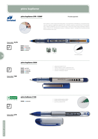 artyku%u0142y pi%u015bmienne521700 m 0,3 mm165010 czarne165011 czerwone165012 niebieskie165013 zieloneProdukt japo%u0144ski%u2192 ig%u0142owa ko%u0144c%u00f3wka 0,5 mm%u2192 stabilny kapilarny system podawania tuszu%u2192 okienka umo%u017cliwiaj%u0105ce kontrol%u0119 zu%u017cycia tuszu%u2192 skuwka z%u00a0metalowym klipsem166031 czarne166032 czerwone166033 niebieskie166034 zielone%u2192 funkcja spr%u0119%u017cynuj%u0105cego wk%u0142adu%u2192 okienko kontroli zu%u017cycia tuszu%u2192 wymienny wk%u0142ad LE 022 102055 niebieskiePi%u00f3ro kulkowe z%u00a0cienko pisz%u0105c%u0105 ko%u0144c%u00f3wk%u0105 ig%u0142ow%u0105. Tusz pigmentowy wodoodporny, o%u00a0konsystencji p%u0142ynnego %u017celu, zapewnia wyj%u0105tkow%u0105 wydajno%u015b%u0107 oraz mo%u017cliwo%u015b%u0107 pisania po powierzchniach trudnowsi%u0105kliwych. Stabilne podawanie tuszu a%u017c do ostatniej kropli. Ceramiczna kulka pisz%u0105ca zapobiega %u201edrapaniu%u201d papieru. Kulka 0,5 mm. Wentylowana skuwka z%u00a0metalowym klipsem. Transparentna obudowa pozwala na kontrolowanie ilo%u015bci tuszu.ko%u0144c%u00f3wka ig%u0142owapi%u00f3ro kulkowe 2108pi%u00f3ro kapilarne 2004pi%u00f3ro kapilarne CFR-155NP100101441214412Cena netto: 13,70Cena netto: 7,00Cena netto: 5,70pi%u00f3ra kapilarne